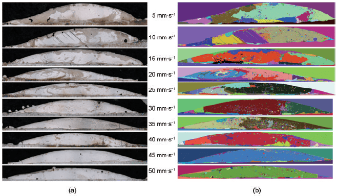 Cross-sectional OM images of the coating with different laser scanning rates (a), and cross-sectional images after the Image Segmentation Software processing (b)