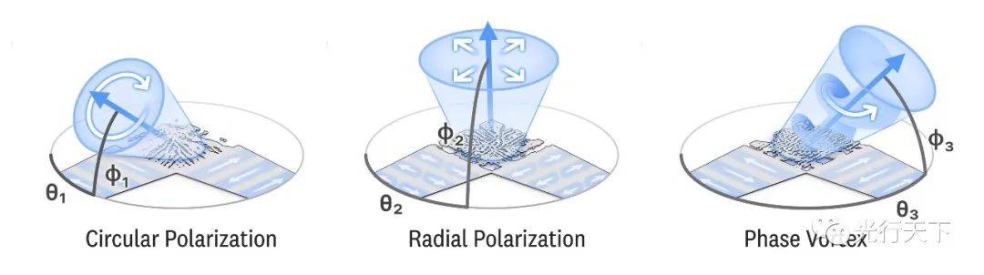 NIST構(gòu)建的新型光子芯片如何塑造入射光束的三個例子。芯片內(nèi)的薄層由五氧化二鉭制成,形成一種結(jié)構(gòu),可以根據(jù)其水平方向(θ)和層上方的高度(φ)改變出射光束(光束振動的平面)的偏振。芯片可以重塑光束的形狀,以圓形模式或徑向模式振動。此外,材料的結(jié)構(gòu)可以將光束重塑為渦旋,從而改變其相位(光波在其波峰和谷值周期中的位置)。