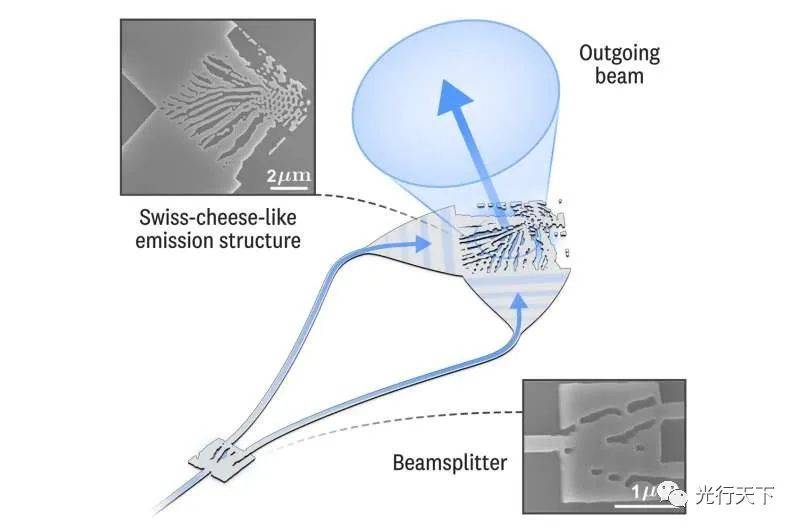 當光束進入光子芯片時,它被引導(dǎo)到分束器將光波分成兩部分的區(qū)域。在每個位置,一層薄薄的五氧化二鉭的瑞士奶酪狀結(jié)構(gòu)改變了光波的許多特性,包括其相位和偏振。