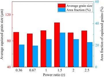 圖8為A區(qū)晶粒尺寸和等軸晶粒面積分?jǐn)?shù)隨功率比變化的變化規(guī)律。當(dāng)功率比從0.36增加到1.5時(shí),A區(qū)的平均晶粒尺寸從93.33μm增加到107.9μm,當(dāng)功率比增加到2.5時(shí),A區(qū)的平均晶粒尺寸減小到95.6μm。