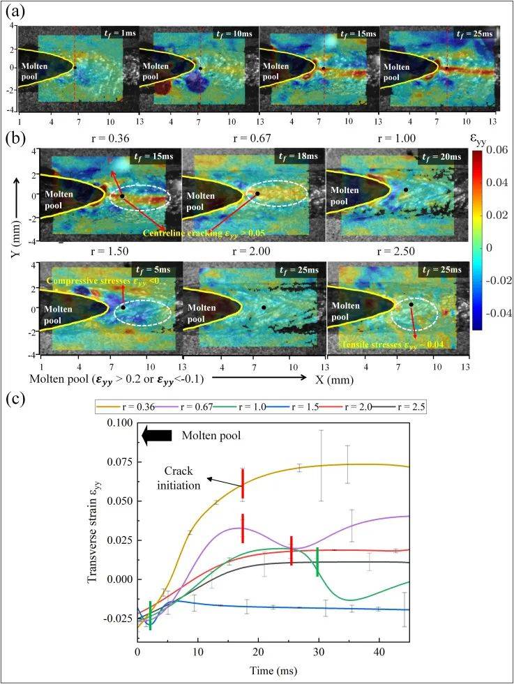 圖5所示。(a) r = 0.36時(shí)P點(diǎn)應(yīng)變隨時(shí)間變化的等高線圖;(b) P = 6000W時(shí)不同功率比下焊縫應(yīng)變峰值位置的橫向應(yīng)變場(chǎng);(c) P點(diǎn)應(yīng)變隨時(shí)間變化的等高線圖。