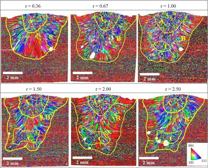 圖7所示。EBSD IPF圖顯示了不同功率比和恒定總功率P = 6000W下焊縫的晶粒結(jié)構(gòu)。請(qǐng)注意,在r=0.36和r=0.67時(shí),由于非局部分布特征,C區(qū)沒有在圖中突出顯示。