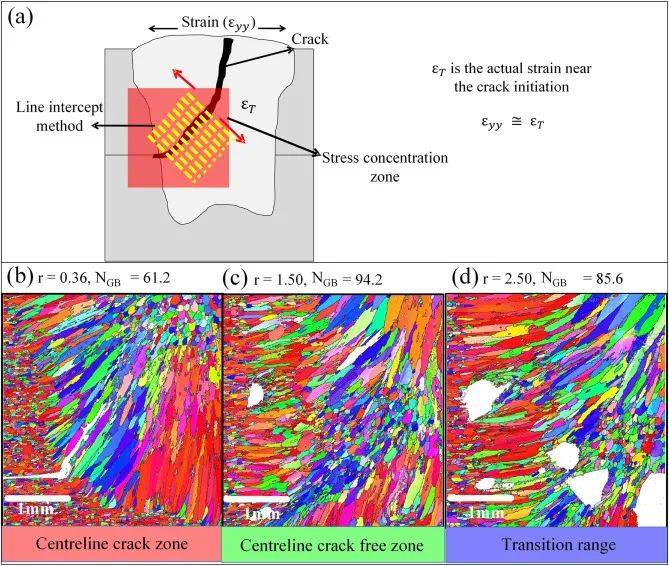圖12所示。(a)不同功率比作用在焊縫上的應(yīng)變示意圖及裂紋產(chǎn)生的應(yīng)力集中區(qū)(SCZ);功率比分別為(b) r = 0.36, (c) r = 1.5, (d) r = 2.5。需要注意的是,NGB(晶界數(shù))是使用線截法計(jì)算的,在應(yīng)力集中區(qū)以45度角相交。