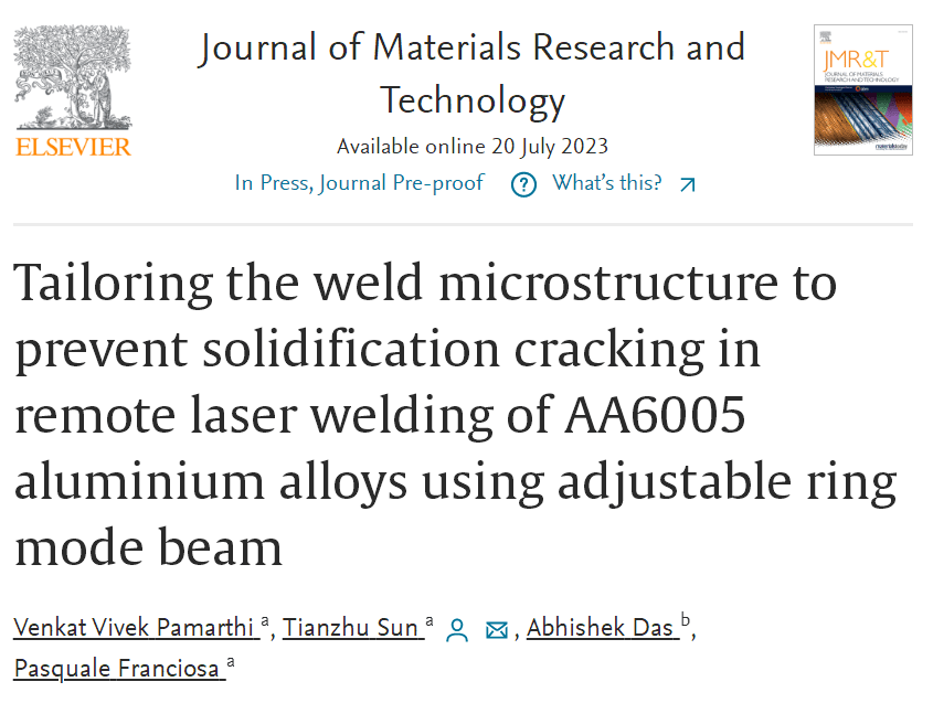 英國(guó)沃里克大學(xué)、印度理工學(xué)院一組研究團(tuán)隊(duì)采用可調(diào)環(huán)模式光束對(duì)AA6005鋁合金遠(yuǎn)程激光焊接中焊縫微觀結(jié)構(gòu)進(jìn)行調(diào)整,防止凝固開裂。相關(guān)研究成果以“Tailoring the weld microstructure to prevent solidification cracking in remote laser welding of AA6005 aluminium alloys using adjustable ring mode beam”為題發(fā)表在《Journal of Materials Research and Technology》上。