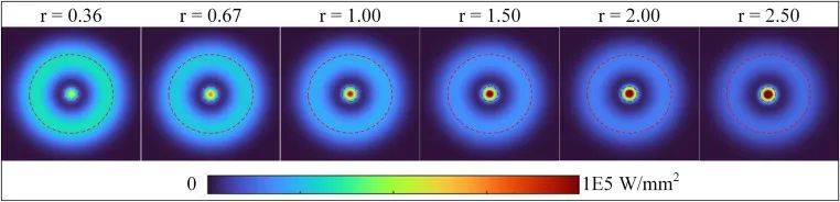 圖2所示。恒總功率為6000W時(shí),不同功率比下可調(diào)環(huán)模式(ARM)激光器的穩(wěn)態(tài)光束強(qiáng)度分布。
