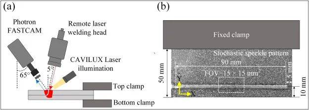 圖1所示。(a)使用原位高速相機(jī)成像的自約束試驗(yàn)臺(tái)設(shè)置示意圖;(b) DIC隨機(jī)散斑樣本,顯示相機(jī)視覺的詳細(xì)視場(chǎng)位置。