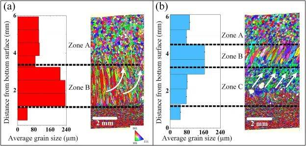 圖11所示。(a)功率比為0.36、總功率為6500W和(b)功率比為1.5、總功率為6000W時(shí)焊縫的縱向截面EBSD IPF圖和晶粒尺寸沿厚度方向分布。