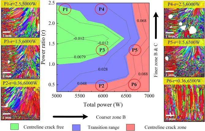 圖6所示。等高線圖顯示(a)峰值橫向峰值應(yīng)變的演變(b)在不同功率比和總激光功率下,通過染料滲透試驗(yàn)確定的中心線裂紋行為。注意,確定了三個(gè)處理窗口,包括中線無(wú)裂紋區(qū)、過渡區(qū)和中線裂紋區(qū)。(在過渡區(qū),觀察到小而離散的中線裂縫)
