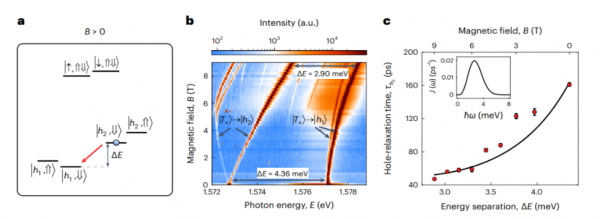 利用拉比Rabi振蕩和Ramsey干涉證明了俄歇過程的相干性。利用這種相干性還進(jìn)一步研究了單空穴弛豫機(jī)制。實(shí)驗(yàn)觀察到了161皮秒的空穴弛豫時(shí)間,并將其歸因于聲子瓶頸效應(yīng)phonon bottleneck effect。