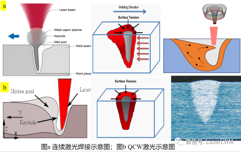 2、QCW優(yōu)勢—熔池穩(wěn)定:熔池匙孔受力情況,連續(xù)激光作用時(shí)間長,熱傳導(dǎo)面積大,熔池面積大,液態(tài)金屬多,所以連續(xù)焊接的熔池遠(yuǎn)大于QCW激光的熔池。氣孔、裂紋、飛濺等缺陷皆和熔池息息相關(guān):如熔池大,熔池的表面張力隨溫度升高降低,大熔池更容易出現(xiàn)匙孔坍塌如a3所示;QCW激光焊接由于能量更為集中,作用時(shí)間短,熔池主要圍繞匙孔周圍均勻存在,受力均勻,氣孔、裂紋、飛濺相對發(fā)生率更低。