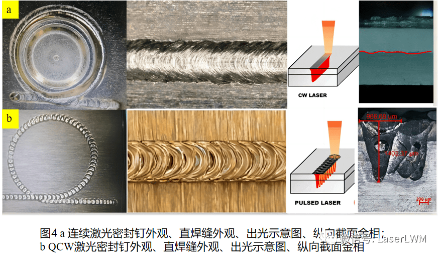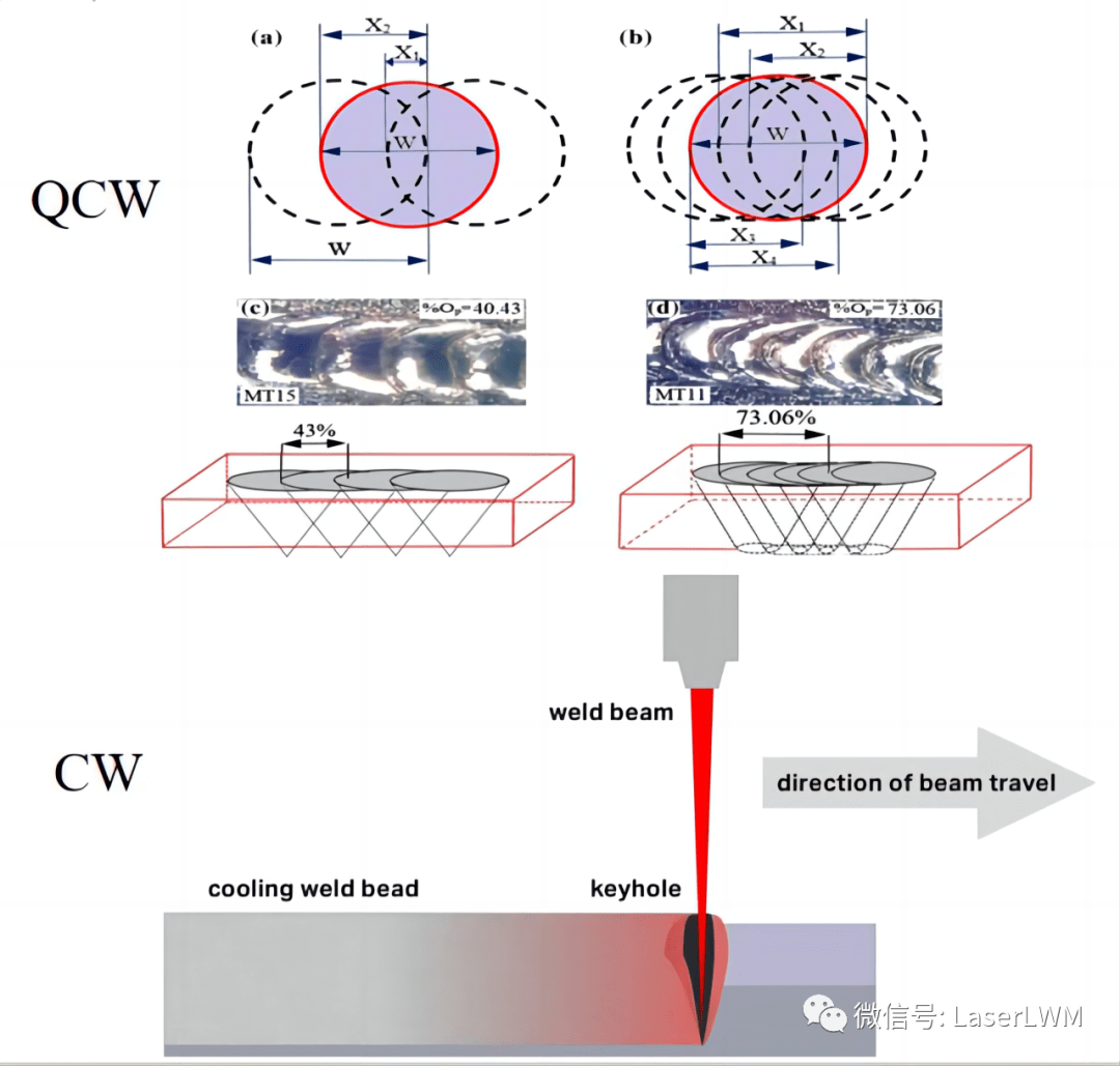 1、從金相上看:如左圖所示,QCW脈沖焊接屬于金相拼接,且頻率上限大多在500Hz左右,重疊率低了有效熔深淺,重疊率高了,速度上不去,效率低下;連續(xù)激光則可以通過不同芯徑激光、焊接頭的選擇實(shí)現(xiàn)高效連續(xù)的焊接,在一些對密封性要求較高的場合連續(xù)激光更為穩(wěn)妥;