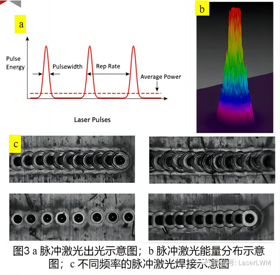 QCW是“quasi-continuous wave”的縮寫,即準(zhǔn)連續(xù)波激光器。脈沖激光器圖a所示,通常激光是一個(gè)斷續(xù)出光的過程;圖b為激光能量分布,相比單模連續(xù)激光,QCW的能量分布更為集中,意味著QCW有著比連續(xù)激光器更大的能量密度(穿透能力更強(qiáng)),反映到金相上就是有更大的熔深穿透能力,打出來的金相類似釘子,深寬比較大QCW的高峰值激光功率、高能量密度使得QCW在高反合金、熱敏感性材料、微連接上有巨大優(yōu)勢;圖c為不同頻率的脈沖激光器焊接示意圖,可以看出脈沖焊接較為穩(wěn)定,幾乎沒有飛濺[1]。
