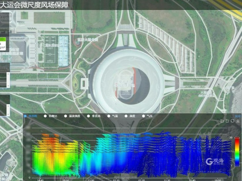 “點燃主火炬時需要知道場內(nèi)風速的大小?!薄拔覀兎浅jP注冠頂?shù)娘L速和風向,想知道有形狀的焰火在燃放時能不能達到預期效果。”“場館周邊地區(qū)的霧霾、降雨等氣象條件將對交通產(chǎn)生什么影響?”……在賽事風險管理的調(diào)度例會上,工作人員對大運會期間的氣象信息提出了明確的需求,并重點關注極端天氣監(jiān)測預警問題,以避免對開幕式演出儀式及賽事的正常進行產(chǎn)生影響。為保障開閉幕式及主場館賽事活動的順利進行,鐳測創(chuàng)芯提供了多部風廓線及三維掃描型激光雷達,開展了氣象保障服務,實現(xiàn)了場館內(nèi)外高、中、低垂直梯度場的三維風場數(shù)據(jù)監(jiān)測,為周邊的微尺度氣象條件分析提供了裝備支撐。