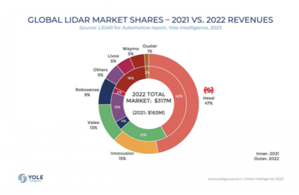 禾賽自成立以來,已累計(jì)交付超過19萬臺(tái)激光雷達(dá)。本季度禾賽的營收及激光雷達(dá)交付量,再次超過6家國際上市同行公司總和,持續(xù)領(lǐng)跑全球激光雷達(dá)市場。據(jù)國際權(quán)威研究機(jī)構(gòu)Yole Intelligence最新報(bào)告,禾賽科技以強(qiáng)勁的實(shí)力獲得車載激光雷達(dá)領(lǐng)域多項(xiàng)全球第一,是唯一一個(gè)連續(xù)兩年蟬聯(lián)“多項(xiàng)全球第一”的中國企業(yè)。2022年,禾賽激光雷達(dá)全球市占率為47%,遠(yuǎn)超第二名(占比為15%)。 另據(jù)蓋世汽車研究院最新數(shù)據(jù)顯示,2023年上半年,禾賽科技在中國激光雷達(dá)市場份額達(dá)51.4%,裝機(jī)量排名第一。