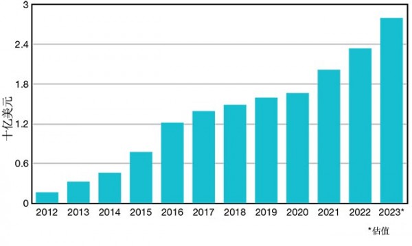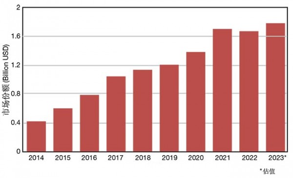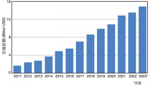 圖8:2015-2023年間中國的超快激光器市場增長示意圖。