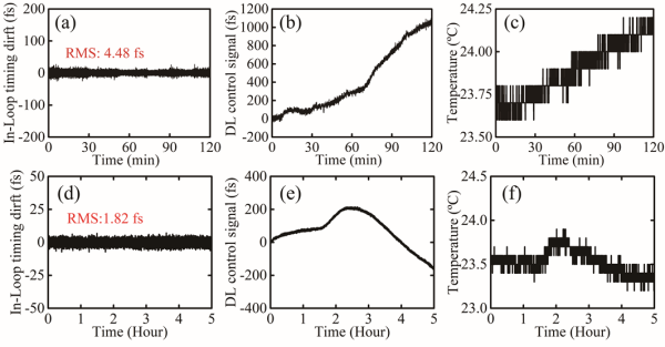 科研團隊發(fā)展了激光同步技術(shù),對激光裝置前端作了高精度時間抖動測量和實時反饋,實現(xiàn)了復(fù)雜強激光系統(tǒng)的飛秒級同步。激光裝置前端結(jié)構(gòu)如圖1所示。該研究利用平衡光學(xué)互相關(guān)測量、時間延遲反饋等技術(shù),分別對種子源系統(tǒng)、預(yù)放大系統(tǒng)作了時間抖動的測量和校正(結(jié)果如圖2所示)?;谧灾鞔罱ǖ臅r間同步系統(tǒng),種子源系統(tǒng)的同步精度達(dá)到1.82fs,預(yù)防大系統(tǒng)的同步精度達(dá)到4.48fs,實現(xiàn)了百太瓦級激光系統(tǒng)的飛秒級同步。該研究為超強激光及同類大科學(xué)裝置的同步系統(tǒng)建設(shè)奠定了技術(shù)基礎(chǔ),并為基于超強激光和自由電子激光的聯(lián)合實驗研究提供了條件。