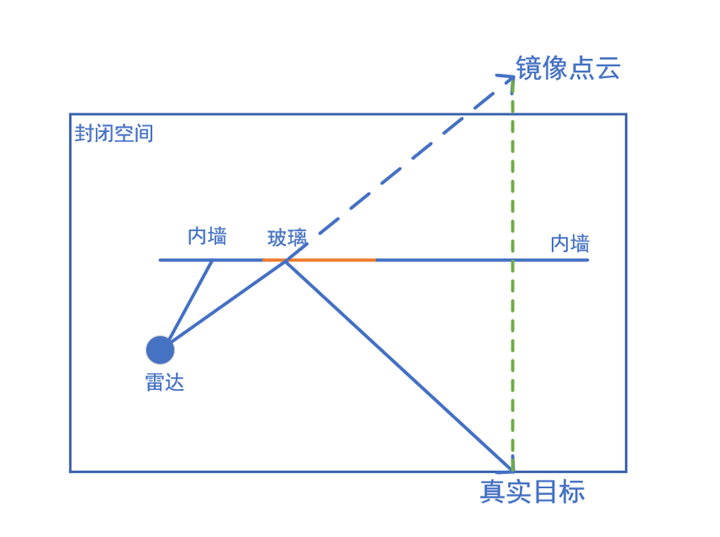 如圖所示,在室內(nèi)走廊有玻璃的環(huán)境下,當(dāng)發(fā)射光束以較大的入射角度掃描到玻璃時(shí),玻璃反射回的光能量非常微弱,無法被檢測(cè)到。因?yàn)榇蟛糠职l(fā)射光透過鏡面反射出去,掃描到其他的反射能力較強(qiáng)的真實(shí)目標(biāo)后,才原路反射回來被檢測(cè)到,隨后,虛假點(diǎn)云在入射角度的延長(zhǎng)線上,呈鏡像方式表現(xiàn)出來,進(jìn)而影響機(jī)器人后續(xù)的定位和導(dǎo)航。