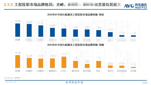 日前,奧維睿沃(AVC Revo)發(fā)布《2023H1中國大陸激光投影市場研究報(bào)告》顯示,2023年上半年,激光投影市場(不包含放映機(jī)、微投)整體銷量達(dá)18.4萬臺,銷額實(shí)現(xiàn)47.7億元。細(xì)分領(lǐng)域方面,工程激光、教育激光市場光峰科技(688007.SH)銷量、銷額市場份額均位列第一,專業(yè)顯示激光持續(xù)領(lǐng)跑行業(yè)。
