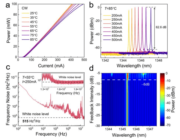 近期,中國科學(xué)院半導(dǎo)體研究所材料科學(xué)重點(diǎn)實(shí)驗(yàn)室研究員楊濤-楊曉光團(tuán)隊(duì)與研究員陸丹,聯(lián)合浙江大學(xué)兼之江實(shí)驗(yàn)室教授吉晨,在高功率、低噪聲的量子點(diǎn)DFB單模激光器研究方面取得重要進(jìn)展。該團(tuán)隊(duì)采用高密度、低缺陷的疊層InAs/GaAs量子點(diǎn)結(jié)構(gòu)作為有源區(qū),結(jié)合低損耗側(cè)向耦合光柵作為高效選模結(jié)構(gòu),研制出寬溫區(qū)內(nèi)高功率、高穩(wěn)定、低噪聲、抗反饋的高性能O波段量子點(diǎn)DFB激光器。在25-85 °C范圍內(nèi),激光器輸出功率均大于100 mW,最大邊模抑制比超過62 dB;最低的白噪聲水平僅為515 Hz2 Hz-1,對(duì)應(yīng)的本征線寬低至1.62 kHz;最小平均RIN僅為-166 dB/Hz(0.1-20 GHz)。此外,激光器的抗光反饋閾值高達(dá)-8 dB,滿足無外部光隔離器下穩(wěn)定工作的技術(shù)標(biāo)準(zhǔn)。該器件綜合性能優(yōu)異,兼具低成本、小體積的優(yōu)勢(shì),在大容量光通信、高速片上光互連、高精度探測(cè)等領(lǐng)域具有規(guī)模應(yīng)用前景。
