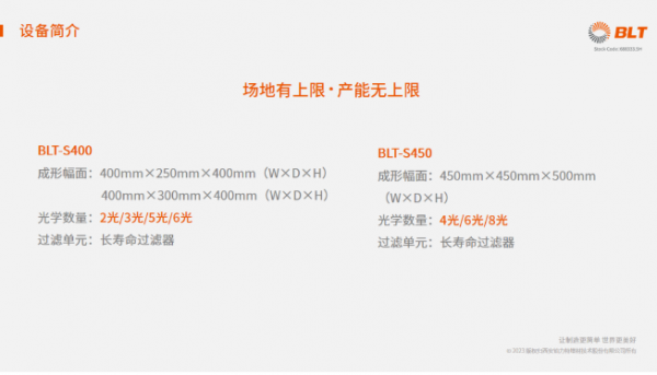 新發(fā)布的BLT-S400在原有成形尺寸上增加了400mm×300mm×400mm的新方案,同時(shí)光學(xué)數(shù)量增加至六光。BLT-S450在不改變原有成形尺寸的基礎(chǔ)上將光學(xué)數(shù)量增加至八光。