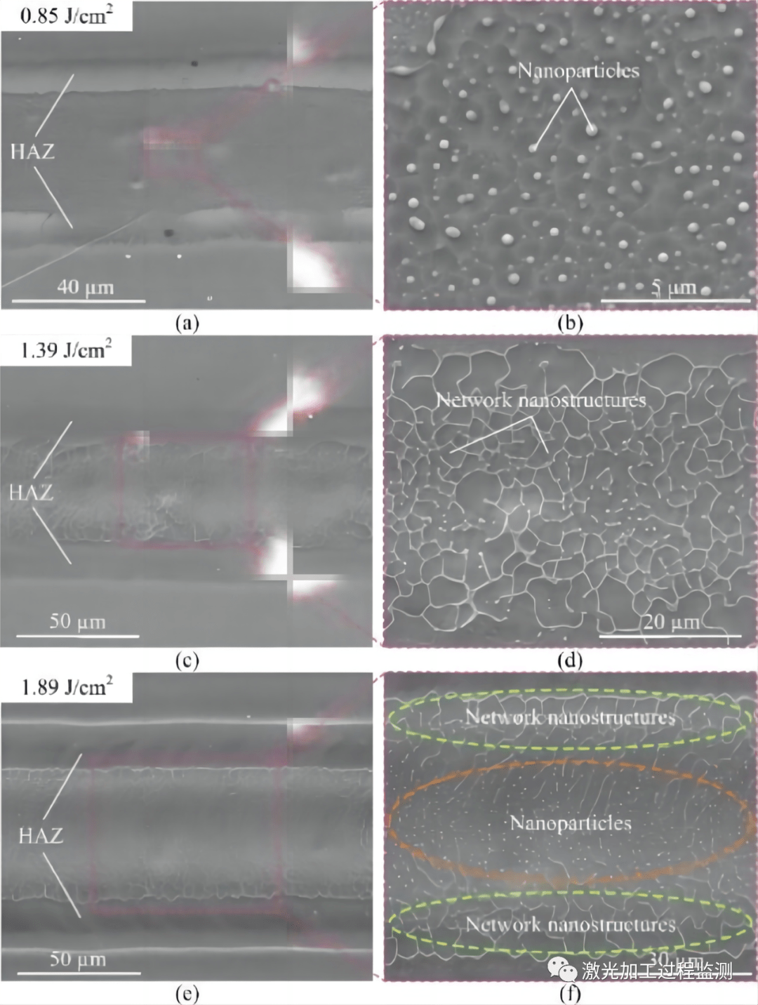 圖13.不同激光能量密度下激光照射后鐵基MG表面的SEM形貌:(a、b)0.85J/cm2、(c、d)1.39J/cm2和(e、f)1.89J/cm2