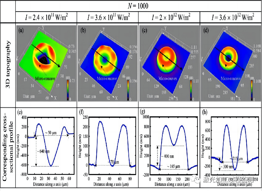 圖10.在各種峰值激光功率強(qiáng)度下獲得的激光燒蝕區(qū)域的3D拓?fù)?(e)–(h)為圖3(a)–(d)中標(biāo)記線的橫截面剖面圖,實(shí)驗(yàn)的激光脈沖數(shù)量均為1000。
