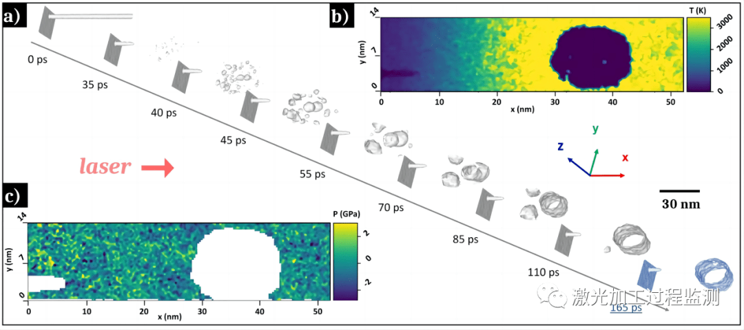 圖1.分子動(dòng)力學(xué)模擬顯示了超短激光照射下Zr-Cu金屬玻璃表面納米空腔的發(fā)展,峰值能量F=0.06J/cm2和一次激光射擊。輻照模擬開始后165ps納米孔周圍溫度和c壓力的演變。