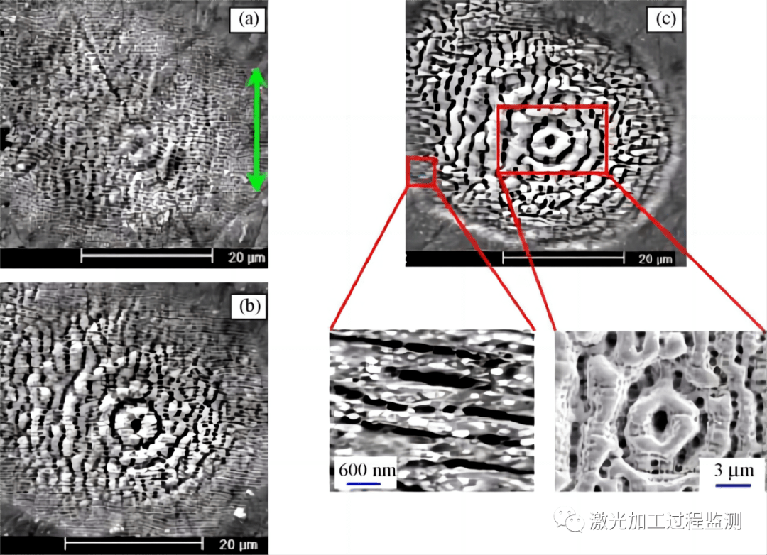 圖4.多脈沖飛秒激光器在0.18J/cm2的低能量通量下照射的樣品的表面形態(tài).(a)N=10,(b)N=30和(c)N=100。