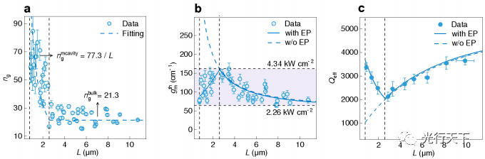 進(jìn)一步,該工作從實(shí)驗(yàn)和理論兩方面進(jìn)行了探索,揭示了激子極化激元在實(shí)現(xiàn)亞微米連續(xù)激光源中的作用機(jī)制。亞微米尺寸鈣鈦礦中增強(qiáng)的光子-激子耦合作用導(dǎo)致群折射率顯著增大至約80,進(jìn)而大幅提升其模式增益以補(bǔ)償模式損耗。同時(shí),這也導(dǎo)致鈣鈦礦亞微米激光源可具有更高的有效微腔品質(zhì)因子和更窄的發(fā)射線寬(圖2)。該機(jī)制也為開發(fā)基于其他半導(dǎo)體材料的小尺寸低閾值激光器提供了新見解。