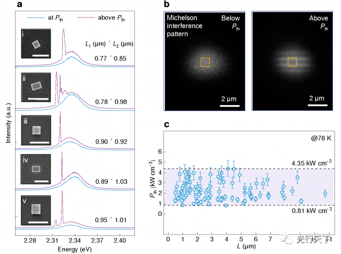 該工作利用化學(xué)氣相沉積法在藍(lán)寶石襯底上制備了全無機(jī)鈣鈦礦CsPbBr3單晶微米片,觀察到室溫下鈣鈦礦激子與回音壁微腔光子發(fā)生強(qiáng)耦合,形成激子極化激元。通過發(fā)射強(qiáng)度從線性到非線性變化、線寬變窄、發(fā)射偏振轉(zhuǎn)變和閾值處空間相干性轉(zhuǎn)變等一系列證據(jù),證實(shí)了亞微米尺寸CsPbBr3單晶片的連續(xù)光泵浦熒光激射,其器件面積最低至0.65μm2。同時(shí)發(fā)現(xiàn),亞微米激光光源的閾值與大尺寸激光光源相當(dāng),甚至可以更低(圖1)。
