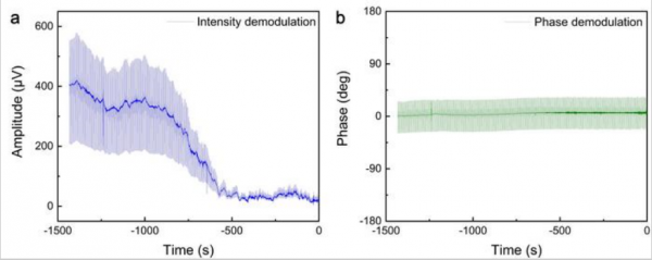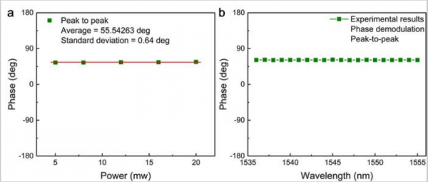 研究人員驗(yàn)證了FPI的相位與微振動(dòng)有關(guān)。與強(qiáng)度解調(diào)方法相比,使用相位解調(diào)方法獲得的峰峰值與探測(cè)激光功率和波長(zhǎng)無(wú)關(guān)。因此,不再需要穩(wěn)定正交工作點(diǎn)(Q 點(diǎn))。