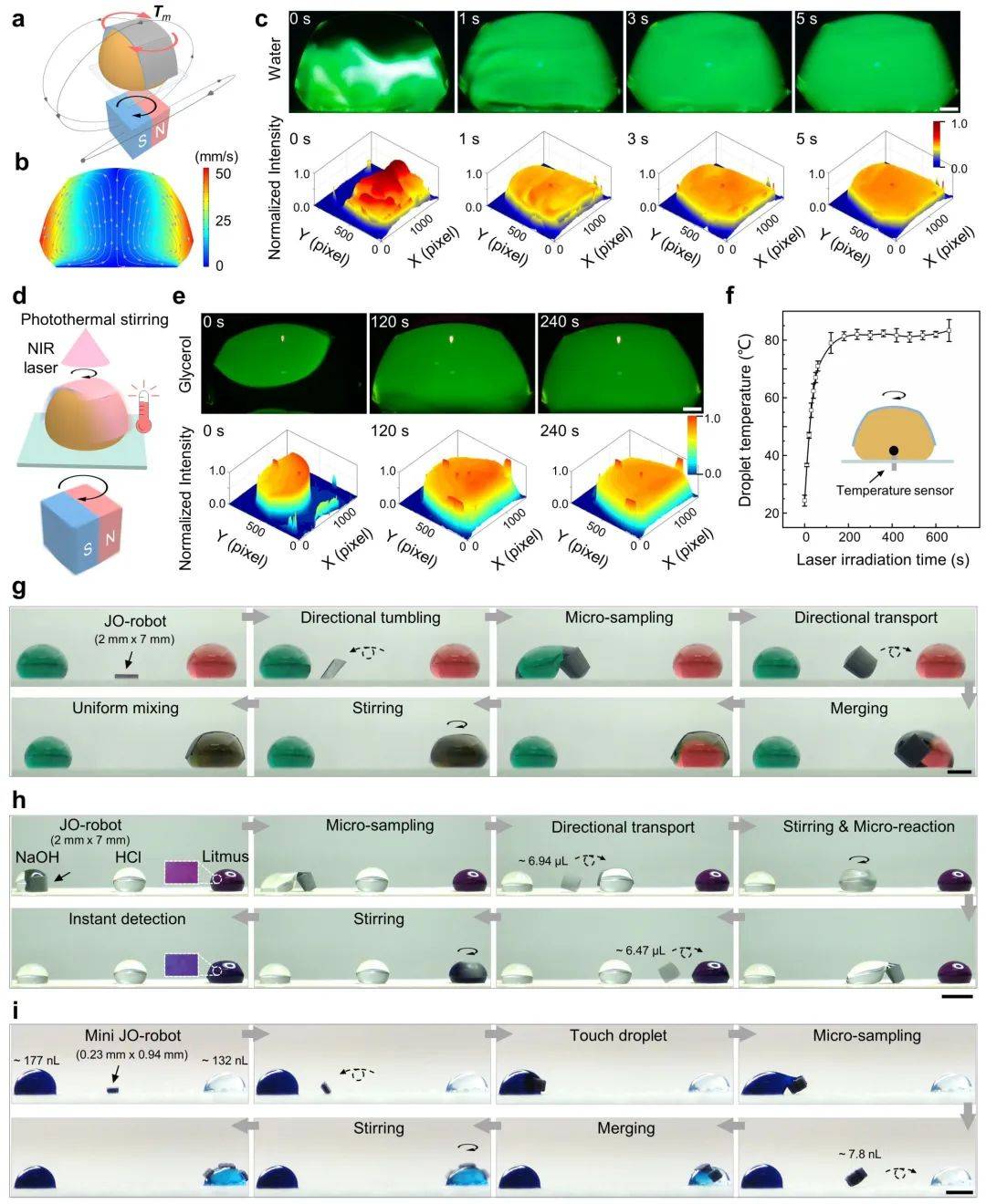 圖2.基于磁響應雙面神折紙機器人的液滴攪拌、光熱攪拌以及多功能液滴操縱集成
