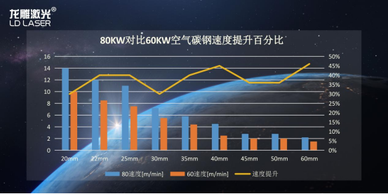 憑借硬件能力的提升,新一代8萬瓦激光切割機的切割性能也有了大幅度提升。與6萬瓦激光切割機對比,在空氣切割20-60mm碳鋼領(lǐng)域,8萬瓦激光速度提升30-50%。而在不銹鋼切割領(lǐng)域,8萬瓦激光切割速度比6萬瓦提升20-30%(20-100mm)。