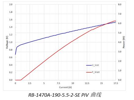 本次發(fā)布的1470nm芯片型號(hào)為RB-1470A-190-5.5-2-SE,發(fā)光條寬190μm,工作電流15A,工作功率5.5W,光電轉(zhuǎn)換效率23%。