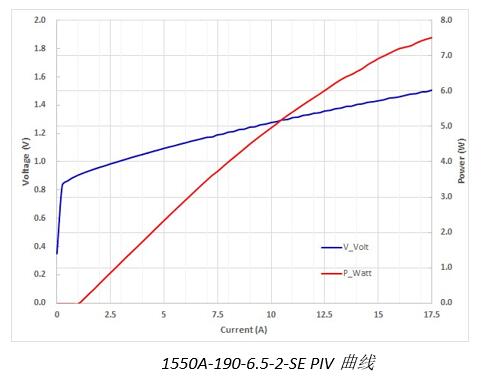 本次發(fā)布的1550nm芯片型號(hào)為RB-1550A-190-6.5-2-SE,發(fā)光條寬190μm,工作電流15A,工作功率6.5W,光電轉(zhuǎn)換效率29%。
