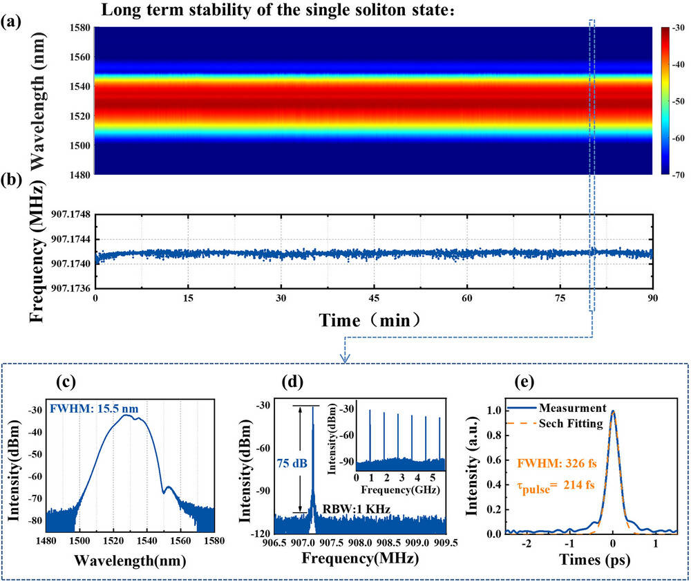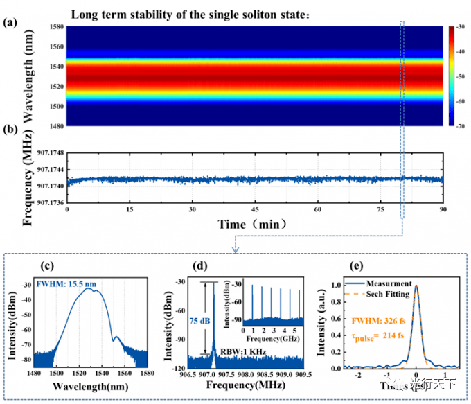 圖2.單孤子狀態(tài)連續(xù)運行90分鐘的穩(wěn)定性:(a)測量光譜的時間演變,色條表示光功率譜密度。(b)重復頻率的變化。(c)典型光譜和(d) 80分鐘時的射頻頻譜。(e)輸出脈沖的典型自相關(guān)信號。