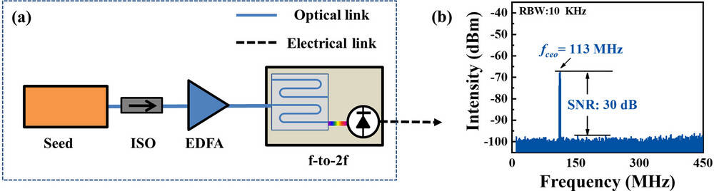 圖3.(a)基于f-to-2f的載波包絡(luò)偏移頻率檢測。 (b)在10 kHz RBW下自由運行ceo拍頻信號。