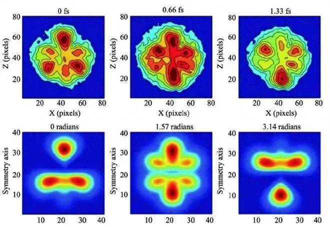 圖 采用阿秒光脈沖串聯(lián)合紅外激光對(duì)阿秒電子波包成像的實(shí)驗(yàn)結(jié)果(上)和理論結(jié)果(下)