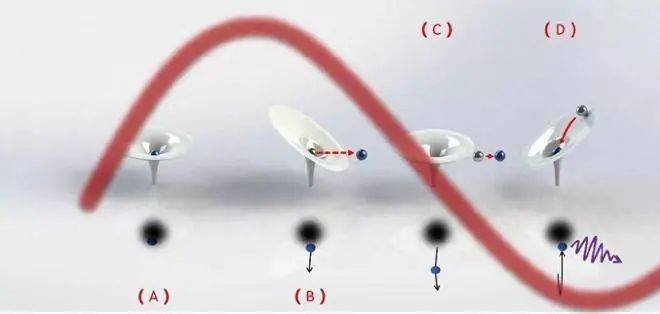 圖 阿秒脈沖產(chǎn)生的三步模型。(A)原子的庫(kù)侖場(chǎng)和其中的電子;(B)在強(qiáng)激光場(chǎng)作用下發(fā)生隧穿電離,電子離開原子;(C)脫離原子的電子在強(qiáng)激光場(chǎng)中加速,獲得能量;(D)電子回到原子中,在激光場(chǎng)中獲得的能量以一個(gè)極紫外光子的形式釋放出來。