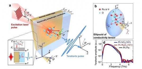 研究人員利用電各向異性,基于導(dǎo)體的異質(zhì)結(jié)構(gòu)開發(fā)了一種用于太赫茲脈沖形成的非相對論機制。(a)各向異性導(dǎo)體RuO2和IrO2的電導(dǎo)率張量的橢球體。(b)所產(chǎn)生脈沖的特征(c,d)。