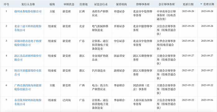 深交所方面,節(jié)前一周也共新受理了5家公司,連同此前9月22日和9月6日分別受理的廣西北部灣陸海新能源股份有限公司(下稱陸海新能)、東莞優(yōu)邦材料科技股份有限公司,深交所9月份共計新受理了7家公司。這7家公司中,陸海新能的融資計劃額16億元為最大,另一家浙江美晶新材料股份有限公司的預計融資金額15個億。