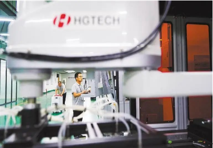 華工科技激光高端裝備制造車間,技術(shù)人員在調(diào)試超薄玻璃激光切割裝備
