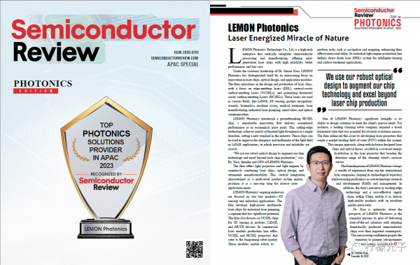 檸檬光子榮獲Semiconductor Review-《半導(dǎo)體評(píng)論》雜志2023年度“亞太地區(qū)十大光電解決方案商。2023年9月,Semiconductor Review-《半導(dǎo)體評(píng)論》對(duì)檸檬光子進(jìn)行了深度采訪,采訪結(jié)束后,Semiconductor Review-《半導(dǎo)體評(píng)論》主編表示,檸檬光子是一家杰出的半導(dǎo)體激光高科技企業(yè)。