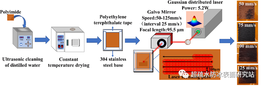 本文面向當前電熱式主動除防冰高耗能的發(fā)展瓶頸,結(jié)合當前行業(yè)內(nèi)疏水材料防冰技術(shù)的前沿,借助可同時實現(xiàn)石墨烯生成和精密圖案化設計的激光誘導石墨烯技術(shù)(Laser-Induced Graphene, LIG),使用常見的10.6 μm CO2激光直接輻照于聚酰亞胺薄膜(PI),通過對激光的掃描速度進行調(diào)節(jié)(50-125 mm/s),在常壓條件下成功地一步制備了同時具有疏水/超疏水性和電熱功能的微米級溝壑狀石墨烯表面,拓寬了新型除防冰器件的制備方法。