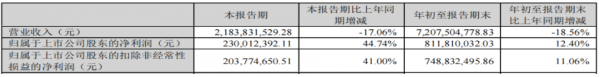 10月26日,華工科技產(chǎn)業(yè)股份有限公司(以下簡(jiǎn)稱“華工科技”)發(fā)布了2023年三季度業(yè)績(jī)快報(bào)稱。報(bào)告期內(nèi),華工科技實(shí)現(xiàn)營收21.84億元,同比下降17.06%;歸屬于上市公司股東的凈利潤2.30億元,同比增長(zhǎng)44.74%。公司前三季度共營收72.08億元,同比下降18.56%;歸屬于上市公司股東凈利潤8.12億元,同比增長(zhǎng)12.40%。