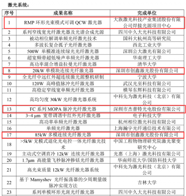 可喜的是,深圳市激光智能制造行業(yè)協(xié)會5家會員單位在列,其中,副會長單位大族激光的“RMP環(huán)形光束模式可調(diào)QCW激光器”、副會長單位杰普特的“FC系列MOPA脈沖光纖激光器”、以及會員單位創(chuàng)鑫激光的“20kW單模塊連續(xù)光纖激光器”、“85kW多模連續(xù)光纖激光器”入選激光系統(tǒng)提名名單,另外,副會長單位水滴激光的“飛機蒙皮復(fù)合高功率激光清洗系統(tǒng)”、“高鐵齒輪變速箱7000W復(fù)合激光清洗系統(tǒng)”與會員單位星漢激光的“高功率半導(dǎo)體激光器”則入選應(yīng)用裝備提名名單。