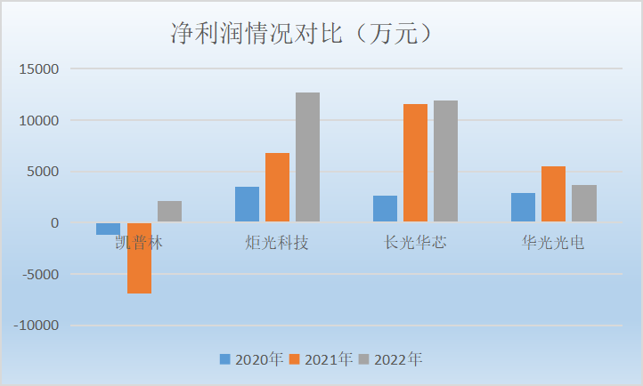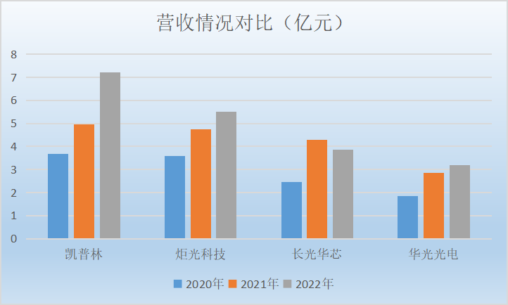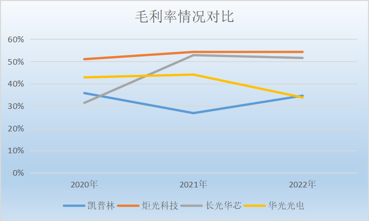 對比同行的業(yè)績情況發(fā)現(xiàn),凱普林業(yè)務(wù)規(guī)模較大,但盈利水平較低;炬光科技營收、凈利潤均保持持續(xù)增長趨勢;而長光華芯2022年?duì)I收已經(jīng)出現(xiàn)下滑,凈利潤略有增長;華光光電的業(yè)務(wù)規(guī)模偏小,2022年毛利率也大幅下滑,在同行中處于墊底水平。