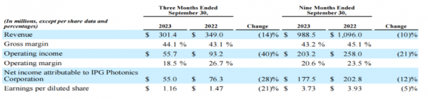 近日,美國IPG Photonics發(fā)布了第三季度最新財報。據(jù)財報顯示,2023年第三季度IPG實現(xiàn)營收3.01億美元,同比下降14%;凈利潤為0.55億美元,同比下降28%,毛利率為44.1%。...