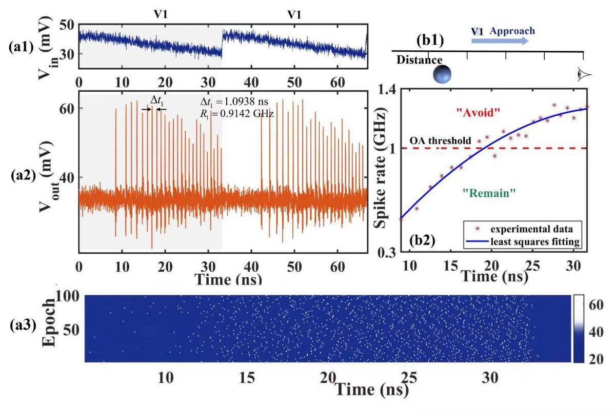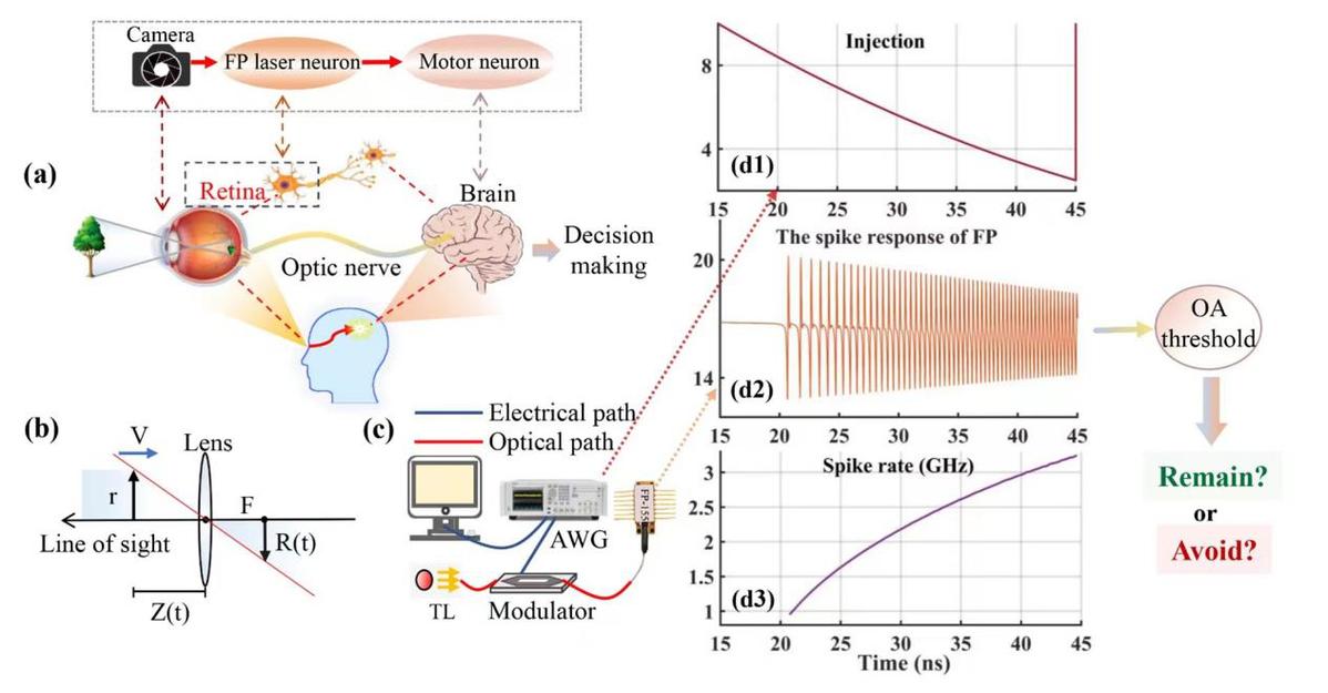 大多數(shù)自主機(jī)器人導(dǎo)航和避障系統(tǒng)都依賴激光成像探測(cè)、雷達(dá)、高精度GPS等傳感器來感知與障礙物之間的距離。這些傳感器具有功耗大、成本高、難以收集相關(guān)目標(biāo)數(shù)據(jù)的特點(diǎn)。而且一些小型無人機(jī)的有效載荷有限,迫切需要更簡(jiǎn)單的系統(tǒng)架構(gòu)、低功耗、優(yōu)化的處理和實(shí)時(shí)的性能。針對(duì)以上的問題,團(tuán)隊(duì)提出了基于單個(gè)光子脈沖神經(jīng)元的模擬視覺神經(jīng)系統(tǒng)的超快視覺避障方法并進(jìn)行實(shí)驗(yàn)性驗(yàn)證,整個(gè)系統(tǒng)由單個(gè)相機(jī),F(xiàn)abry–Pérot激光器,運(yùn)動(dòng)神經(jīng)元組成,分別模擬人眼的感光細(xì)胞,視網(wǎng)膜神經(jīng)元,大腦。該系統(tǒng)在沒有任何事先訓(xùn)練的情況下感知信息。它不限于特定場(chǎng)景,也不需要額外的傳感器輸入??梢越档陀?jì)算和硬件成本。單個(gè)Fabry–Pérot激光器神經(jīng)元可以實(shí)時(shí)將外部光學(xué)注入編碼為具有不同速率的超快尖峰事件。尖峰速率值被用于生成必要的控制命令以實(shí)現(xiàn)安全的避障。激光器的處理速率可以達(dá)到5GHz。這項(xiàng)研究為載荷有限的小型設(shè)備做出超快的避障響應(yīng)提供一個(gè)可行的方案,并證明了在多種不同的運(yùn)動(dòng)場(chǎng)景下解決避障問題的能力,為未來應(yīng)對(duì)復(fù)雜的避障場(chǎng)景奠定了基礎(chǔ)。