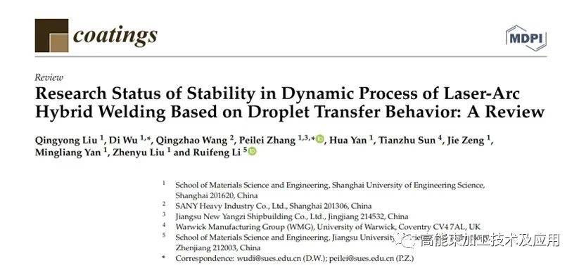 上海工程技術(shù)大學(xué)材料科學(xué)與工程學(xué)院張培磊教授與英國華威大學(xué)、上海交通大學(xué)、江蘇科技大學(xué)學(xué)者組成的國際聯(lián)合研究團隊在《Coatings》期刊上發(fā)表名為“Research Status of Stability in Dynamic Process of Laser-Arc Hybrid Welding based on Droplet Transfer Behavior: A Review”的綜述文章。